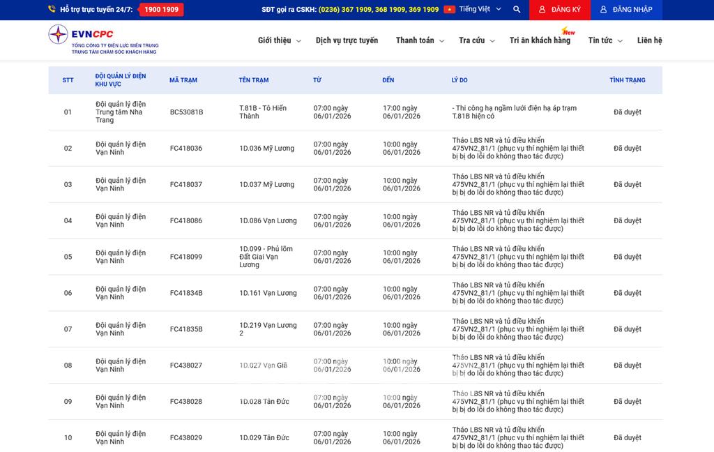 Lịch cắt điện Khánh Hòa ngày mai 6/1 trên website của EVNCPC cập nhật ngày 5/1. Ảnh: Bnews/vnanet.vn