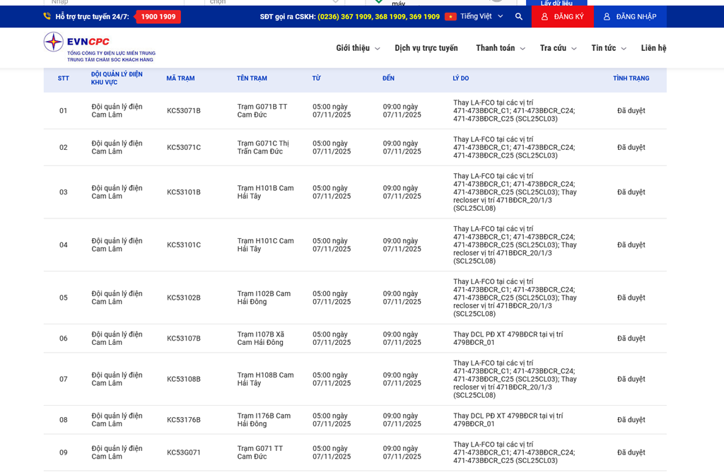 | 5 | Đội quản lý điện Cam Lâm | KC53102B | Trạm I102B Cam Hải Đông | 05:00 07/11/2025 | 09:00 07/11/2025 | Thay LA-FCO tại các vị trí 471-473BĐCR_C1; 471-473BĐCR_C24; 471-473BĐCR_C25 (SCL25CL03); Thay recloser vị trí 471BĐCR_20/1/3 (SCL25CL08) | Đã duyệt |