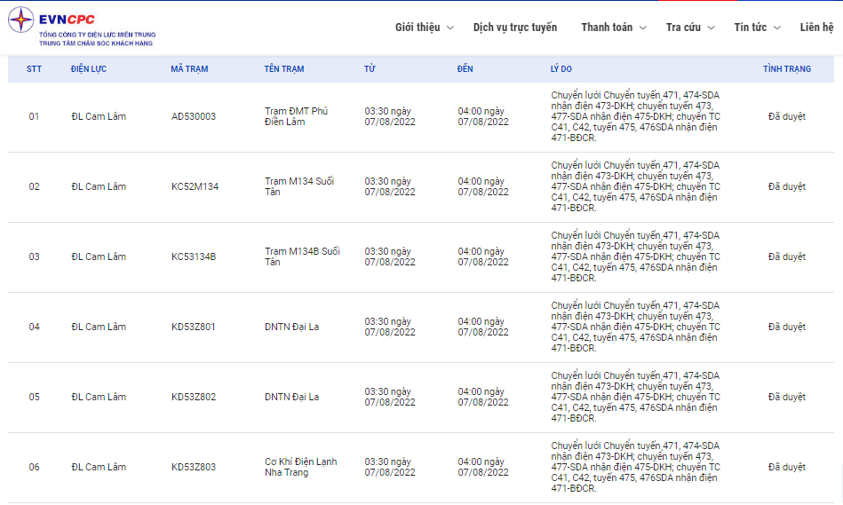 Lịch cắt điện Khánh Hòa ngày mai 7/8 trên website của EVNCPC. Ảnh: BNEWS