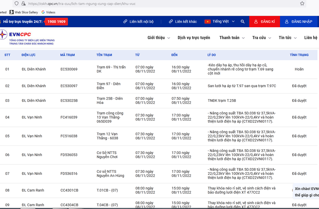 Lịch cắt điện Khánh Hòa ngày mai 8/11 trên website của EVNCPC cập nhật ngày 7/11. Ảnh: BNEWS
