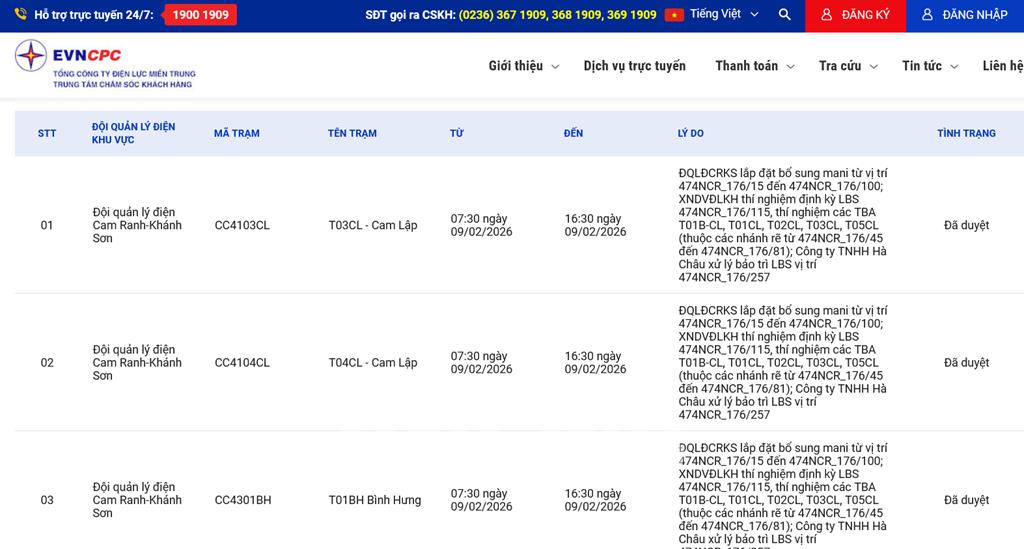 | 6 | Đội quản lý điện Cam Ranh-Khánh Sơn | CC4302CL | T02CL - Cam Lập | 07:30 09/02/2026 | 16:30 09/02/2026 | ĐQLĐCRKS lắp đặt bổ sung mani từ vị trí 474NCR_176/15 đến 474NCR_176/100; XNDVĐLKH thí nghiệm định kỳ LBS 474NCR_176/115, thí nghiệm các TBA T01B-CL, T01CL, T02CL, T03CL, T05CL (thuộc các nhánh rẽ từ 474NCR_176/45 đến 474NCR_176/81); Công ty TNHH Hà Châu xử lý bảo trì LBS vị trí 474NCR_176/257 | Đã duyệt |