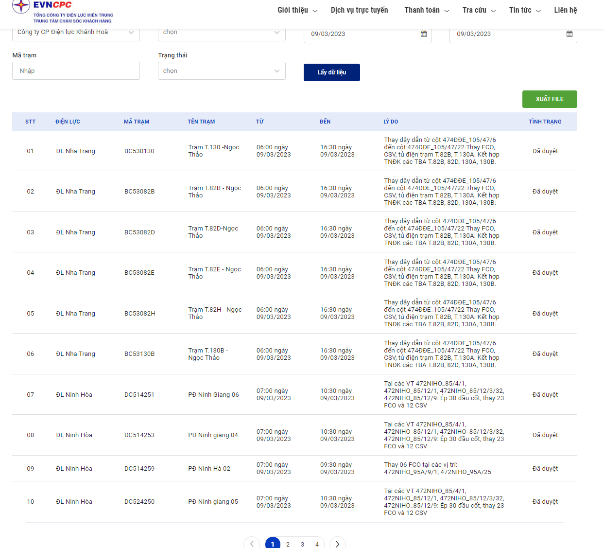 | ĐL Cam Lâm | KC53N554 | Trạm N554 SC (TT Màu) | 9/3/2023 7:00 | 9/3/2023 9:30 | Thay thùng kiểm tính Trạm T.N554 |