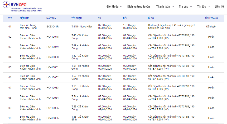 | Điện lực Diên Khánh-Khánh Vĩnh | HC410048 | T.48 - Xã Khánh Đông | 07:00 09/04/2026 | 09:00 09/04/2026 | Cắt điện thu hồi nhánh rẽ 473TCF6B_190 và TBA T.209 (KV) | Hoãn |