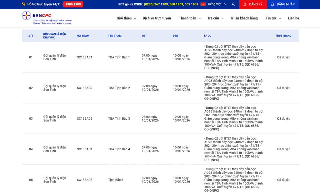 | 5 | Đội quản lý điện Sơn Tịnh | SC13BAC8 | Tịnh Bắc 8 | 07:00 10/01/2026 | 10:00 10/01/2026 | - Dựng 02 cột BTLT thay dây dẫn bọc AC95 thành dây bọc 240mm2 đoạn từ cột 202 - 204 trục chính xuất tuyến 471/T5- Giảm dùng lượng MBA chống vận hành non tải TBA Tịnh Minh 2 từ 160kVA thành 100kVA- Xuất tuyến 471/T5. (QĐ 6886/QĐ-QNPC) | Đã duyệt |