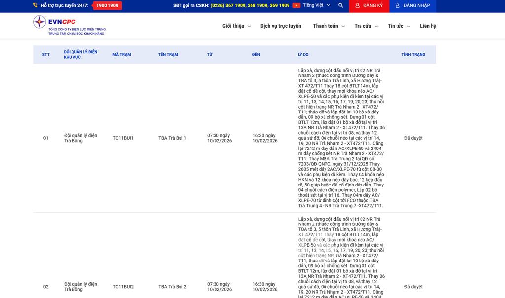 | 1 | Đội quản lý điện Trà Bồng | TC11BUI1 | TBA Trà Bùi 1 | 07:30 10/02/2026 | 16:30 10/02/2026 | Lắp xà, dựng cột đấu nối vị trí 02 NR Trà Nham 2 (thuộc công trình Đường dây & TBA tổ 3, 5 thôn Trà Linh, xã Hương Trà)- XT 472/T11Thay 18 cột BTLT 14m, lắp đặt cổ dề cột, thay mới khóa néo AC/XLPE-50 và các phụ kiện đi kèm tại các vị trí 11, 13, 14, 15, 16, 17, 19, 20, 23; thu hồi cột hiện trạng NR Trà Nham 2 - XT472/T11; tháo dỡ và lắp đặt lại 10 bộ xà dây dẫn, 09 bộ xà chống sét.Dựng 01 cột BTLT 12m, lắp đặt 01 bộ xà đỡ tại vị trí 13A NR Trà Nham 2 - XT472/T11.Thay 06 chuỗi cách điện tại vị trí 08, và thay 12 quả sứ đỡ, 06 chuỗi néo tại các vị trí 14, 19, 20 NR Trà Nham 2 - XT472/T11.Căng lại 7212 m dây dẫn AC/XLPE-50 và 2404 m dây chống sét NR Trà Nham 2 - XT472/T11.Thay MBA Trà Trung 2 tại QĐ số 7203/QĐ-QNPC, ngày 31/12/2025Thay 2605 mét dây 2AC/XLPE-70 từ cột 08-30 và các phụ kiện đi kèm. Thay 04 khóa néo HKN và 12 khóa néo dây bọc, 12 kẹp đấu rẽ, 50 giáp buộc để cố định dây dẫn. Thay 04 chuỗi cách điện polymer, Lắp 02 bộ thoát sét tại vị trí 16. Thay 04m dây AC/XLPE-70 từ đỉnh cột tới FCO thuộc TBA Trà Trung 4 - NR Trà Trung 7 -XT472/T11. | Đã duyệt |