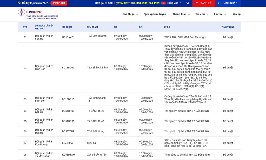 | 4 | Đội quản lý điện Đăk Hà | DC51DR03 | T6 ĐĂK HRING | 08:00 10/03/2026 | 09:00 10/03/2026 | Thí nghiệm định kỳ TBA T7 ĐĂK HRING | Đã duyệt |