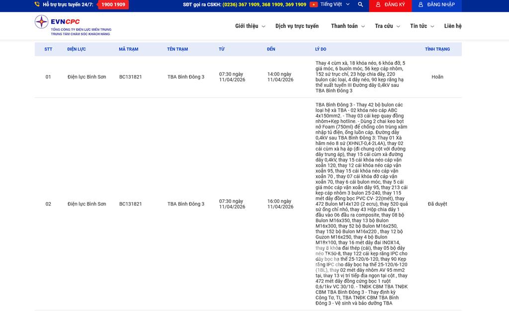 | 1 | Điện lực Bình Sơn | BC131821 | TBA Bình Đông 3 | 07:30 11/04/2026 | 14:00 11/04/2026 | Thay 4 cùm xà, 18 khóa néo, 6 khóa đỡ, 5 giá móc, 6 buoln móc, 56 kẹp cáp nhôm, 152 sứ trục chỉ, 23 hộp chia dây, 220 bulon các loại, 4 dây néo, 90 kẹp răng hạ thế xuất tuyến III Đường dây 0,4kV sau TBA Bình Đông 3 | Hoãn |