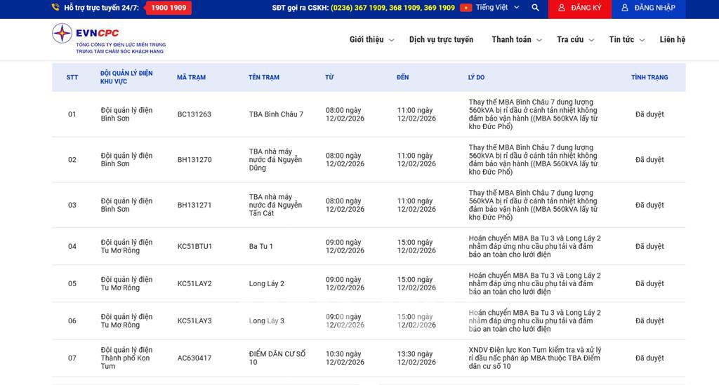 | 7 | Đội quản lý điện Thành phố Kon Tum | AC630417 | ĐIỂM DÂN CƯ SỐ 10 | 10:30 12/02/2026 | 13:30 12/02/2026 | XNDV Điện lực Kon Tum kiểm tra và xử lý rỉ dầu nấc phân áp MBA thuộc TBA Điểm dân cư số 10 | Đã duyệt |