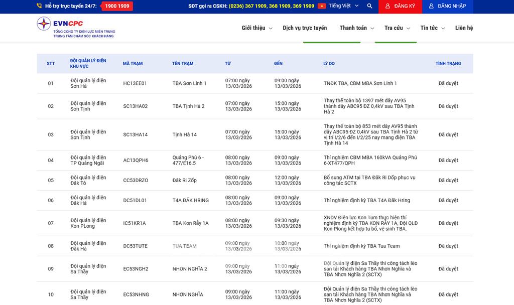 | 6 | Đội quản lý điện Đăk Hà | DC51DL01 | T4A ĐĂK HRING | 08:00 13/03/2026 | 09:00 13/03/2026 | Thí nghiệm định kỳ TBA T4A Đăk Hring | Đã duyệt |