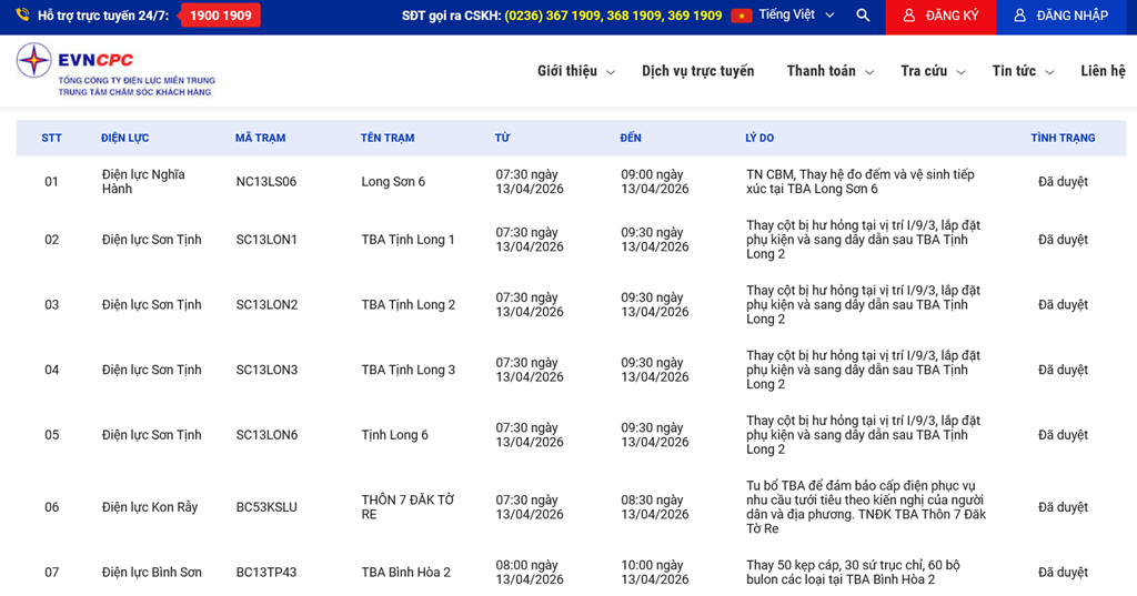 | 1 | Điện lực Nghĩa Hành | NC13LS06 | Long Sơn 6 | 07:30 13/04/2026 | 09:00 13/04/2026 | TN CBM, Thay hệ đo đếm và vệ sinh tiếp xúc tại TBA Long Sơn 6 | Đã duyệt |