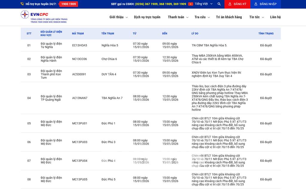 | 4 | Đội quản lý điện TP Quảng Ngãi | AC13NAN7 | TBA Nghĩa An 7 | 08:00 15/01/2026 | 12:00 15/01/2026 | Tháo lèo, bọc cách điện 3 pha đường dây 22kV đỉnh cột TBA Nghĩa An 7-XT478/QNG bằng phương pháp hotlineThay MBA 250kVA kém chất lượng TBA Nghĩa An 7-XT478/QNGĐấu lèo, tháo bọc cách điện 3 pha đường dây 22kV đỉnh cột TBA Nghĩa An 7-XT478/QNG bằng phương pháp hotline | Đã duyệt |