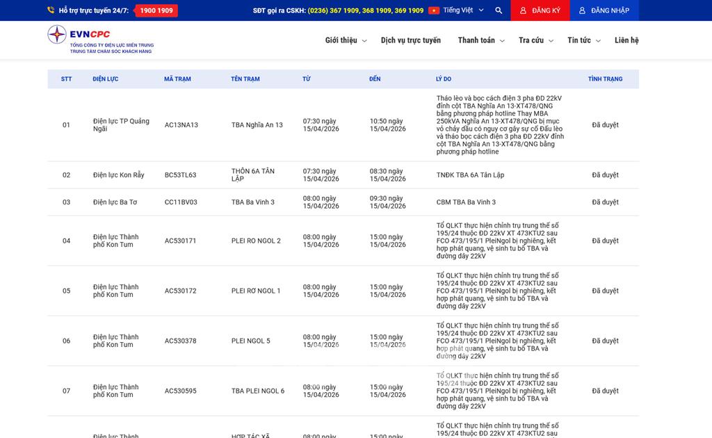 | 8 | Điện lực Thành phố Kon Tum | AD530456 | HỢP TÁC XÃ PHÚC AN | 08:00 15/04/2026 | 15:00 15/04/2026 | Tổ QLKT thực hiện chỉnh trụ trung thế số 195/24 thuộc ĐD 22kV XT 473KTU2 sau FCO 473/195/1 PleiNgol bị nghiêng, kết hợp phát quang, vệ sinh tu bổ TBA và đường dây 22kV | Đã duyệt |