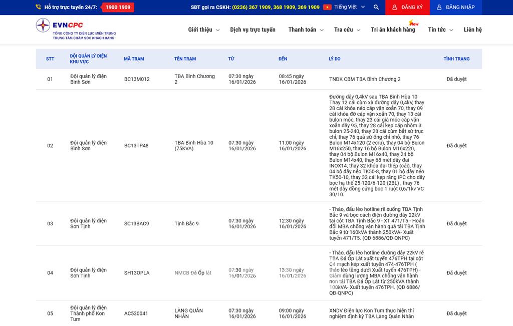 Lịch ngừng cung cấp điện cập nhật mới nhất của các thành phố, thị xã, phường của Khánh Hòa ngày mai 16/1/2026 được cập nhật mới nhất trên website của Tổng công ty Điện lực miền Trung.