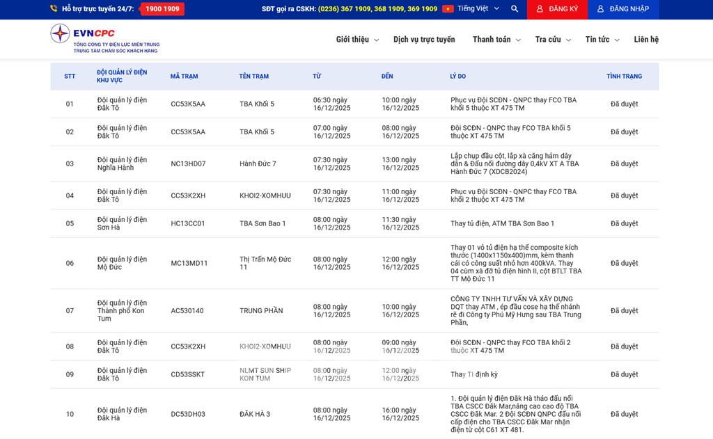 | 9 | Đội quản lý điện Đăk Tô | CD53SSKT | NLMT SUN SHIP KON TUM | 08:00 16/12/2025 | 12:00 16/12/2025 | Thay TI định kỳ | Đã duyệt |