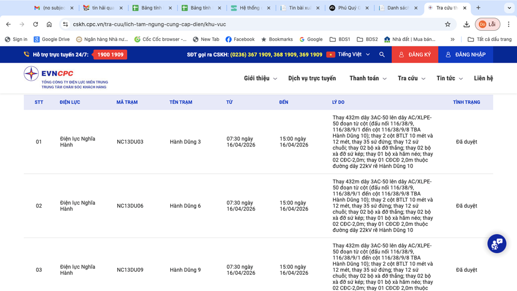 | 2 | Điện lực Nghĩa Hành | NC13DU06 | Hành Dũng 6 | 07:30 16/04/2026 | 15:00 16/04/2026 | Thay 432m dây 3AC-50 lên dâyAC/XLPE-50 đoạn từ cột (đấunối 116/38/9, 116/38/9/1 đến cột116/38/9/8 TBA Hành Dũng10); thay 2 cột BTLT 10 mét và12 mét, thay 35 sứ đứng; thay 12sứ chuỗi; thay 02 bộ xà đỡthẳng; thay 02 bộ xà đỡ sứ kép;thay 01 bộ xà hãm néo; thay 02CĐC-2,0m; thay 01 CĐCĐ2,0m thuộc đường dây 22kV rẽHành Dũng 10 | Đã duyệt |