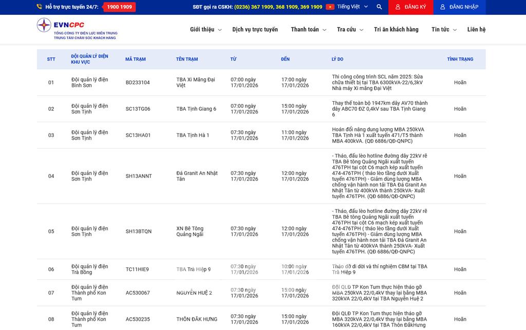 Lịch cắt điện tỉnh Quảng Ngãi ngày mai 17/1 trên website của EVNCPC cập nhật ngày 16/1. Ảnh: Bnews/vnanet.vn