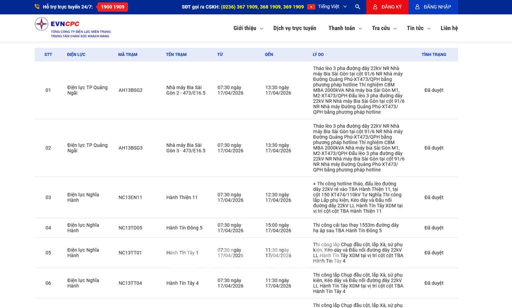 | 3 | Điện lực Nghĩa Hành | NC13EN11 | Hành Thiện 11 | 07:30 17/04/2026 | 12:30 17/04/2026 | #ERROR! | Đã duyệt |