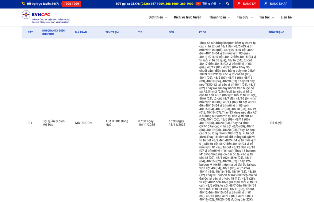 | 3 | Đội quản lý điện Mộ Đức | MC13PU11 | Đức Phú 11 | 07:30 18/11/2025 | 15:30 18/11/2025 | Thay 58 sứ đứng linepost kèm ty 24kV tại các vị trí từ cột 48/1 đến 48/5 (05 vị trí mỗi vị trí 03 quả), 48/6 (01), từ cột 48/7 đến 48/10 (04 vị trí mỗi vị trí 03 quả), 48/11 (01), từ cột 48/12 đến 48/15 (04 vị trí mỗi vị trí 03 quả), 48/16 (04), từ cột 48/17 đến 48/18 (02 vị trí mỗi vị trí 03 quả), 48/19 (01), 48/20 (06).Thay 36 chuỗi cách điện treo bằng polymer 24kV 70KN SC-22P tại các vị trí cột 48 (03), 48/1 (06), 48/6 (09), 48/11 (06), 48/16 (03), 48/19 (06), 48/20 (03).Thay 03 dây néo TK50-12 tại các vị trí 48/1 (01), 48/11 (02).Thay 64 sợi dây nhôm trần buộc cổ sứ A3,5mm2 (2,5m/sợi) tại các vị trí từ cột 48 đến 48/5 (06 vị trí mỗi vị trí 03 sợi), 48/6 (02), từ cột 48/7 đến 48/10 (04 vị trí mỗi vị trí 03 sợi), 48/11 (02), từ cột 48/12 đến 48/15 (04 vị trí mỗi vị trí 03 sợi), 48/16 (04), 48/17 (03), 48/18 (03), 48/19 (01), 48/19 (07).Thay 33 khóa néo dây AC 3 bulong 50-95mm2 tại các vị trí cột 48 (03), 48/1 (06), 48/6 (09), 48/11 (06), 48/19 (06), 48/20 (03).Thay 24 khóa CK7-15 tại các vị trí cột 48/6 (09), 48/11 (06), 48/19 (06), 48/20 (03).Thay 12 kẹp cáp 3 bu lông nhôm 70mm2 tại vị trí cột 48/6.Thay 15 cùm xà đỡ thẳng tại các vị trí từ cột 48/2 đến 48/5 (04 vị trí mỗi vị trí 01 cái), từ cột 48/7 đến 48/10 (04 vị trí mỗi vị trí 01 cái), từ cột 48/12 đến 48/18 (07 vị trí mỗi vị trí 01 cái).Thay 18 buloon M16x50 thép mạ có đai ốc tại các vị trí cột 48 (02), 48/1 (02), 48/6 (04), 48/11 (04), 48/16 (02), 48/20 (02).Thay 126 buloon M14x50 thép mạ có đai ốc tại các vị trí cột 48 (04), 48/1 (06), 48/6 (24), 48/11 (24), 48/16 (14), 48/19 (12), 48/20 (12).Thay 51 buloon M16x250 thép mạ có đai ốc tại các vị trí cột 48 (12), 48/1 (28), từ cột 48/2 đến 48/5 (04 vị trí mỗi vị trí 01 cái), 48/6 (08), từ cột 48/7 đến 48/10 (04 vị trí mỗi vị trí 01 cái), 48/11 (08), từ cột 48/12 đến 48/15 (04 vị trí mỗi vị trí 01 cái), 48/16 (05), 48/17 (01), 48/18 (01), 48/19 (02), 48/20 (04) đường dây 22kV NR Đức Phú 11 | Đã duyệt |