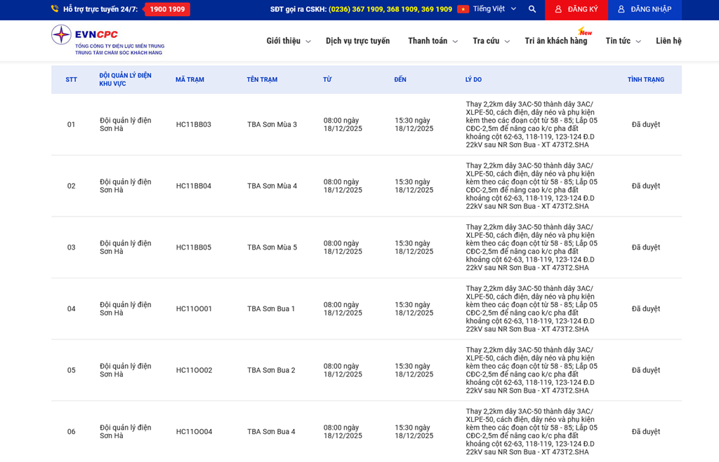 | 10 | Đội quản lý điện Sơn Hà | HC11YY12 | TBA Sơn Long 12 | 08:00 18/12/2025 | 12:00 18/12/2025 | Thay CSV tại TBA Sơn Long 12 - XT 473T2.SHA (Ảnh hưởng Bão số 13)Thay FCO, CSV tại TBA Sơn Long 15 - XT 473T2.SHA (Ảnh hưởng Bão số 13) | Đã duyệt |