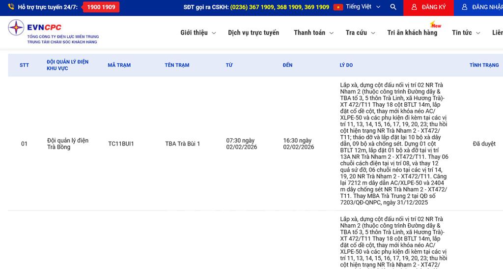 | 7 | Đội quản lý điện Trà Bồng | TC11NHA3 | TBA Trà Nham 3 | 07:30 02/02/2026 | 16:30 02/02/2026 | Lắp xà, dựng cột đấu nối vị trí 02 NR Trà Nham 2 (thuộc công trình Đường dây & TBA tổ 3, 5 thôn Trà Linh, xã Hương Trà)- XT 472/T11Thay 18 cột BTLT 14m, lắp đặt cổ dề cột, thay mới khóa néo AC/XLPE-50 và các phụ kiện đi kèm tại các vị trí 11, 13, 14, 15, 16, 17, 19, 20, 23; thu hồi cột hiện trạng NR Trà Nham 2 - XT472/T11; tháo dỡ và lắp đặt lại 10 bộ xà dây dẫn, 09 bộ xà chống sét.Dựng 01 cột BTLT 12m, lắp đặt 01 bộ xà đỡ tại vị trí 13A NR Trà Nham 2 - XT472/T11.Thay 06 chuỗi cách điện tại vị trí 08, và thay 12 quả sứ đỡ, 06 chuỗi néo tại các vị trí 14, 19, 20 NR Trà Nham 2 - XT472/T11.Căng lại 7212 m dây dẫn AC/XLPE-50 và 2404 m dây chống sét NR Trà Nham 2 - XT472/T11.Thay MBA Trà Trung 2 tại QĐ số 7203/QĐ-QNPC, ngày 31/12/2025 | Đã duyệt |