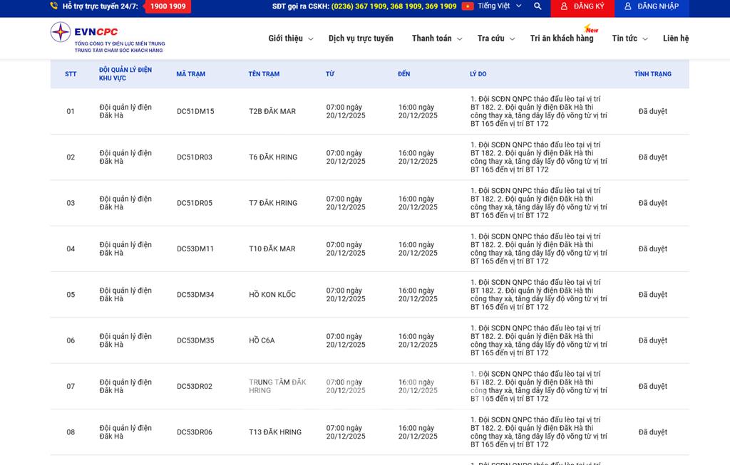 | 7 | Đội quản lý điện Đăk Hà | DC53DR02 | TRUNG TÂM ĐĂK HRING | 07:00 20/12/2025 | 16:00 20/12/2025 | 1. Đội SCĐN QNPC tháo đấu lèo tại vị trí BT 182.2. Đội quản lý điện Đăk Hà thi công thay xà, tăng dây lấy độ võng từ vị trí BT 165 đến vị trí BT 172 | Đã duyệt |