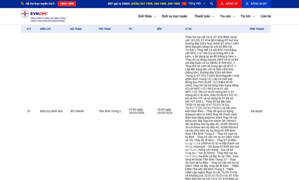 | 1 | Điện lực Bình Sơn | BC134645 | TBA Bình Trung 2 | 07:00 20/03/2026 | 16:00 20/03/2026 | Tháo lèo tại cột 72/4, XT 476/BNG và tại cột 161/35, XT 474/BCH bằng PP hot lineĐường dây 22kV trục chính XT 476/110kV Bình Nguyên (đoạn từ cột 69 đến cột 72/34)+ Thay thế 14 cột BTV-12m bằng cột NPC.I-12-190-3,5 và móng MT-2 đi kèm.+ Sử dụng lại xà đỡ thẳng ly tâm;+ Thay 42 sứ đứng linpost 24kV cả ty và 84 sợi dây buộc cổ sứ (đỉnh) A150mm2.+ Thay thế 24 cùm xà trung áp cột BTLT.+ Lắp đặt bảng tên cột và biển cấm treo (bằng tôn).Đường dây 22kV NR Bình Trung 2/ XT 476 110kV Bình Nguyên ( một phần Bình Trung 12): Lắp 24 mét cáp đồng bọc PVC/XLPE 12,7/24kV M 35 mm2, thay 04 cột bê tông hiện trạng bằng 03 cột NPC.I-12-190-5,4 và 01 cột NPC.I-12-190-3,5 và 03 móng MT-3, 01 móng MT-2 đi kèm, thay 02 bộ ĐT-10T, 01 bộ xà NG-10T và sử dụng lại 01 bộ xà NG-10T (SDL), - Thay 05 bộ dây néo TK50-10 tại các vị trí 72/31/16 (2), 72/31/17 (2), 72/31/15/2(1) và các phụ kiện kèm theo.- Thay 08 quả sứ đứng linepost kèm ty 24kV, thay 48 chuỗi cách điện treo bằng polymer 24kV, thay 09 cái khoá néo dây hợp kim nhôm 50-70mm2, 48 cái khóa néo ép dây AC, ACSR 95mm2, 39 cái khóa néo ép dây AC, ACSR 95mm2 và các phụ kiện xà, bu lông chi tiết kèm theoTBA Bình Trung 2: - Thay 02 cùm xà tủ điện.- Thay 03 cầu chì tự rơi 24kV 100A và dây chảy 8K đi kèm.- Thay 01 tủ điện hạ áp 3 pha 250kVA 02 lộ ra (lắp thanh cái đồng, Aptomat).- Sử dụng 02 bình keo bọt nở Foam chống côn trùng.- Gia cố bê tông nền TBA (0,75m3)- Thay thế các bu lông thép mạ kẽm có đai ốc tại TBA : 3 bu lông M16x50TBA Bình Trung 12: - Thay 02 cùm xà tủ điện.- Thay 03 cầu chì tự rơi 24kV 100A và dây chảy 8K đi kèm.- TNĐK CBM TBA MC NR Bình Trung 2- TNĐK CBM cáp ngầm đoạn từ cột 72/35-72/36 và khoảng cột 72/31/3-72/31/10, XT 476/BNGĐấu lèo tại cột 72/4, XT 476/BNG và tại cột 161/35, XT 474/BCH bằng PP hot line | Đã duyệt |