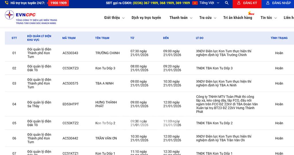 | 1 | Đội quản lý điện Thành phố Kon Tum | AC530343 | TRƯỜNG CHINH | 07:30 21/01/2026 | 09:00 21/01/2026 | XNDV Điện lực Kon Tum thực hiện thí nghiệm định kỳ TBA Trường Chinh | Hoãn |