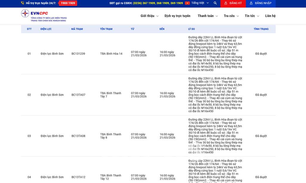 | 1 | Điện lực Bình Sơn | BC131239 | TBA Bình Hòa 14 | 07:00 21/03/2026 | 16:00 21/03/2026 | Đường dây 22kV LL Bình Hòa đoạn từ cột 174/26 đến cột 174/64:- Thay 66 sứ đứng linepost kèm ty 24kV và thay 63,5m dây đồng cứng bọc 1 ruột 0,6/1kv VC 30/10 đi kèm để buộc cổ sứ ; lắp 51 m ống bọc cách điện trung thế cho dây (50-150)mm2.- Thay 40 cái cùm xà trung thế.- Thay 30 bộ bu lông bu lông thép mạ có đai ốc M14x50, 8 bộ bu lông thép mạ có đai ốc M16x250, 8 bộ bu lông thép mạ có đai ốc M16x450 | Đã duyệt |