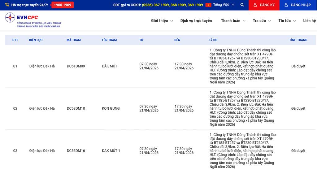 | 9 | Điện lực Đăk Hà | DD53DM27 | Tinh bột sắn Tây Nguyên - Đăk Hà | 07:30 21/04/2026 | 17:30 21/04/2026 | 1. Công ty TNHH Dũng Thành thi công lắp đặt đường dây chống sét trên XT 479ĐH từ BT185-BT257 và BT230-BT230/17. Chiều dài 3,9km.2. Điện lực Đăk Hà tiến hành tu bổ lưới điện, kết hợp phát quang HLT.(Công trình: Lắp đặt dây chống sét trên các đường dây trung áp khu vực trung tâm các phường xã phía tây Quảng Ngãi năm 2026) | Đã duyệt |