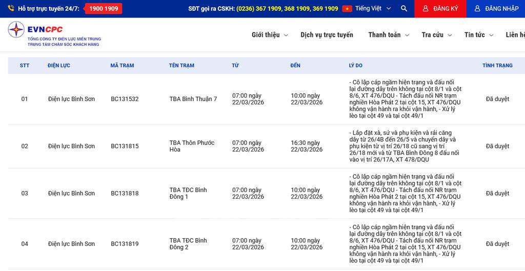 | 9 | Điện lực Bình Sơn | BC131850 | TBA BCH CT NMLD Dung Quất | 07:00 22/03/2026 | 16:30 22/03/2026 | - Lắp xà, phụ kiện và kéo 01 dây chống sét từ cột 06A – 40, dài tuyến 3311 mét xuất tuyến 478/T2.DQU- Lắp xà, phụ kiện đấu nối và đấu nối đường dây 22kV tại vị trí cột 26/25, XT 478/DQU | Đã duyệt |