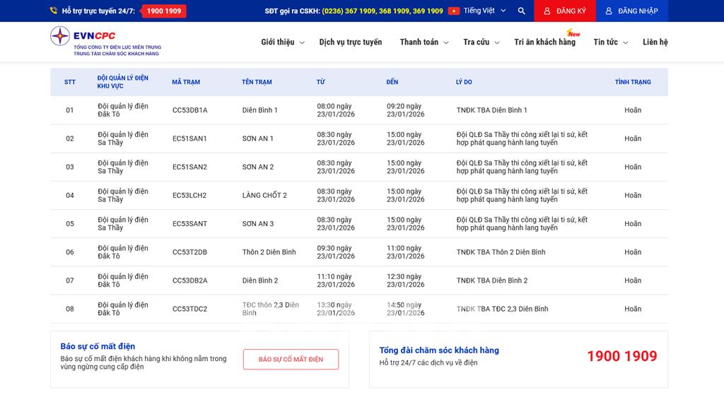 | 1 | Đội quản lý điện Đăk Tô | CC53DB1A | Diên Bình 1 | 08:00 23/01/2026 | 09:20 23/01/2026 | TNĐK TBA Diên Bình 1 | Hoãn |