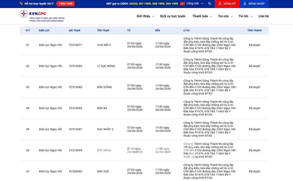 | 7 | Điện lực Ngọc Hồi | FC520093 | ĐĂK DỤC | 07:00 24/04/2026 | 17:00 24/04/2026 | Công ty TNHH Dũng Thành thi công lắp đặt phụ kiện, kéo dây chống sét từ vị trí C59 đến C103 đường dây 22kV Ngọc Hồi - Đăk Glei XT479, 478 TBA 110kV Bờ Y thuộc công trình ĐTXD | Đã duyệt |