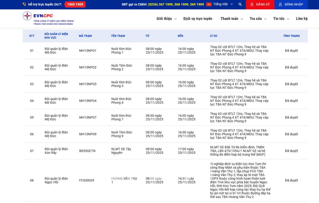 | 5 | Đội quản lý điện Mộ Đức | MH13NPO7 | Nuôi tôm Đức Phong 7 | 08:00 25/11/2025 | 16:00 25/11/2025 | Thay 02 cột BTLT 12m, Thay hệ xà TBA NT Đức Phong 4 XT 474/MDU; Thay cáp lực TBA NT Đức Phong 9 | Đã duyệt |