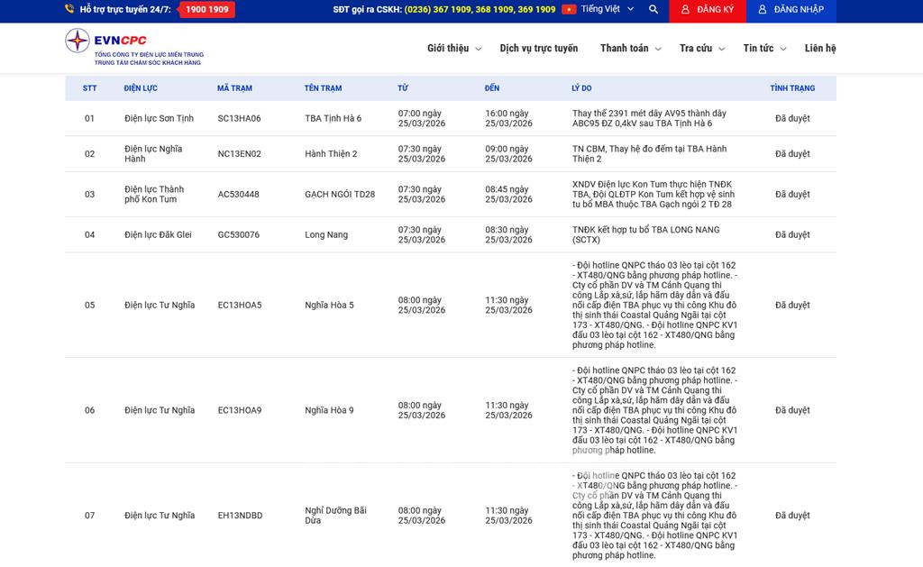 | 7 | Điện lực Tư Nghĩa | EH13NDBD | Nghỉ Dưỡng Bãi Dừa | 08:00 25/03/2026 | 11:30 25/03/2026 | - Đội hotline QNPC tháo 03 lèo tại cột 162 - XT480/QNG bằng phương pháp hotline.- Cty cổ phần DV và TM Cảnh Quang thi công Lắp xà,sứ, lắp hãm dây dẫn và đấu nối cấp điện TBA phục vụ thi công Khu đô thị sinh thái Coastal Quảng Ngãi tại cột 173 - XT480/QNG.- Đội hotline QNPC KV1 đấu 03 lèo tại cột 162 - XT480/QNG bằng phương pháp hotline. | Đã duyệt |