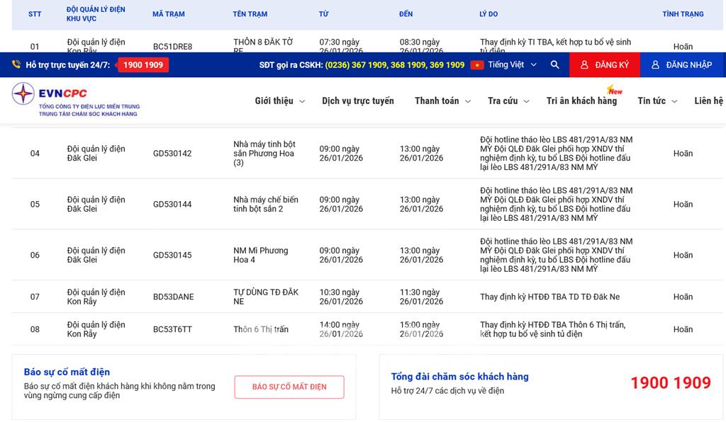 | 8 | Đội quản lý điện Kon Rẫy | BC53T6TT | Thôn 6 Thị trấn | 14:00 26/01/2026 | 15:00 26/01/2026 | Thay định kỳ HTĐĐ TBA Thôn 6 Thị trấn, kết hợp tu bổ vệ sinh tủ điện | Hoãn |