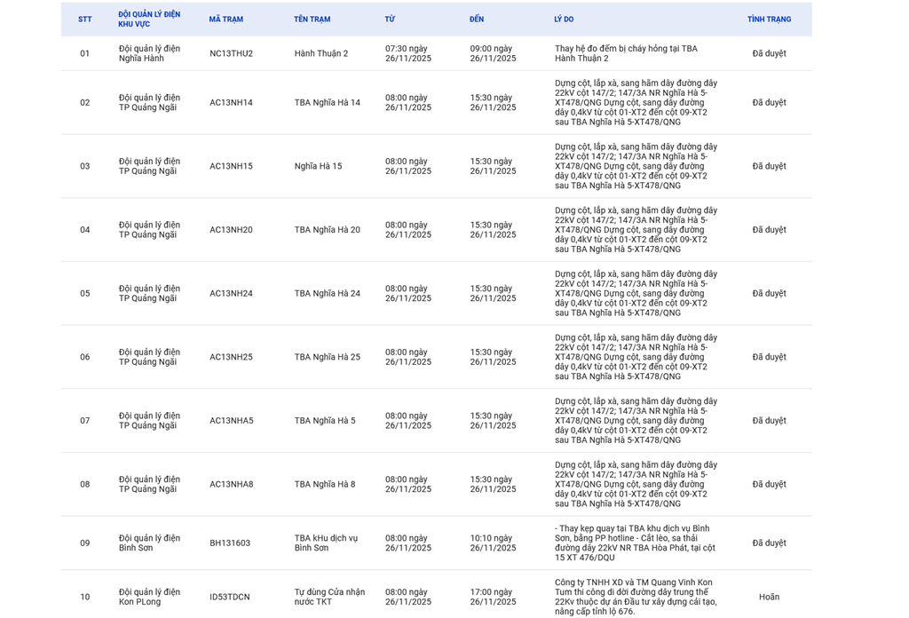 | 2 | Đội quản lý điện TP Quảng Ngãi | AC13NH14 | TBA Nghĩa Hà 14 | 08:00 26/11/2025 | 15:30 26/11/2025 | Dựng cột, lắp xà, sang hãm dây đường dây 22kV cột 147/2; 147/3A NR Nghĩa Hà 5-XT478/QNGDựng cột, sang dây đường dây 0,4kV từ cột 01-XT2 đến cột 09-XT2 sau TBA Nghĩa Hà 5-XT478/QNG | Đã duyệt |