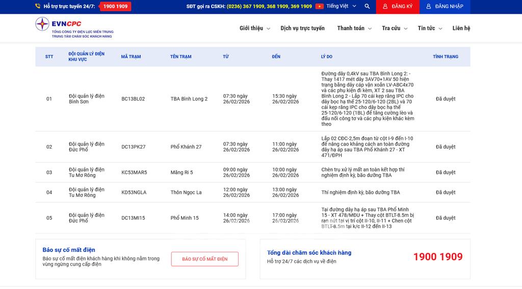| 5 | Đội quản lý điện Đức Phổ | DC13MI15 | Phổ Minh 15 | 14:00 26/02/2026 | 17:00 26/02/2026 | Tại đường dây hạ áp sau TBA Phổ Minh 15 - XT 478/MĐU+ Thay cột BTLT-8.5m bị rạn nứt tại vị trí cột II-10, II-11+ Chen cột BTLT-8.5m tại k/c II-12 đến II-13 | Đã duyệt |
