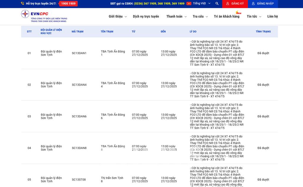 | 6 | Đội quản lý điện Sơn Tịnh | SC13ST09 | Thị trấn Sơn Tịnh 9 | 07:00 27/12/2025 | 13:00 27/12/2025 | - Cột bị nghiêng tại cột 24 XT 474/T5 do ảnh hưởng bão số 13. Vị trí cột góc2. Thay Thế FCO NR CS Trà Khúc 4 thành FCO LTD để đảm bảo chuyển PT cấp điện (Ctr XDCB 2025)- Dựng chèn 01 cột BTLT 12 mét lắp xà, sứ nâng cao độ võng dây dẫn tại khoảng cột 18/25/1 - 18/25/2 NR TT Sơn Tịnh 9 - XT 474/T5 | Đã duyệt |