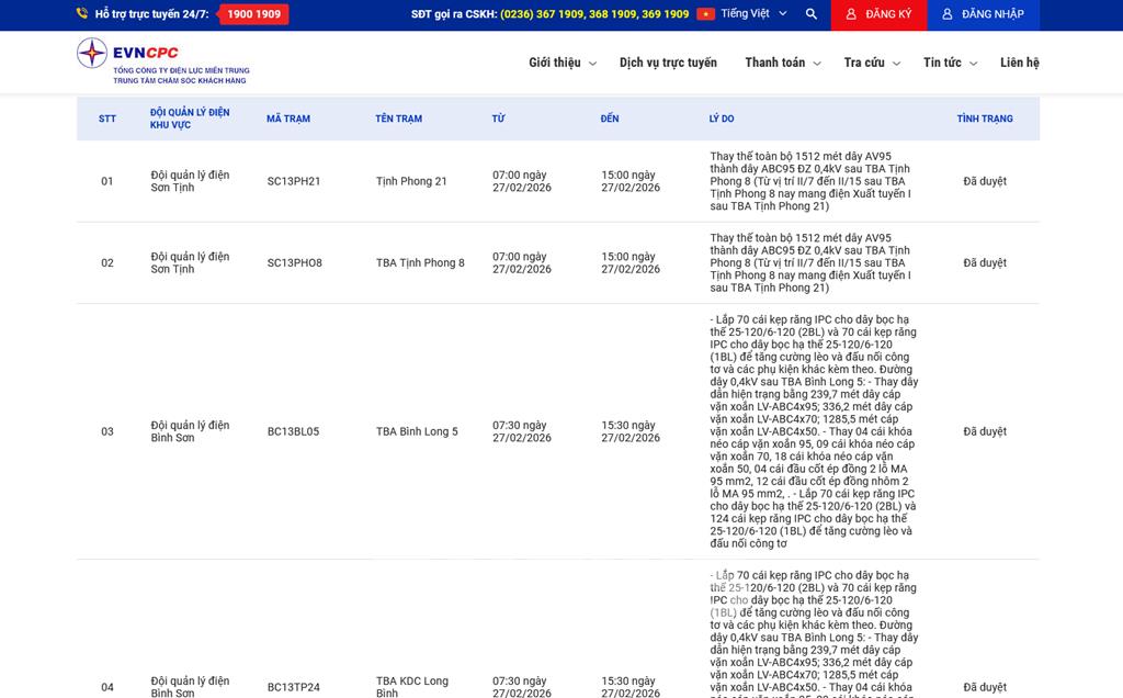 | 2 | Đội quản lý điện Sơn Tịnh | SC13PHO8 | TBA Tịnh Phong 8 | 07:00 27/02/2026 | 15:00 27/02/2026 | Thay thế toàn bộ 1512 mét dây AV95 thành dây ABC95 ĐZ 0,4kV sau TBA Tịnh Phong 8 (Từ vị trí II/7 đến II/15 sau TBA Tịnh Phong 8 nay mang điện Xuất tuyến I sau TBA Tịnh Phong 21) | Đã duyệt |