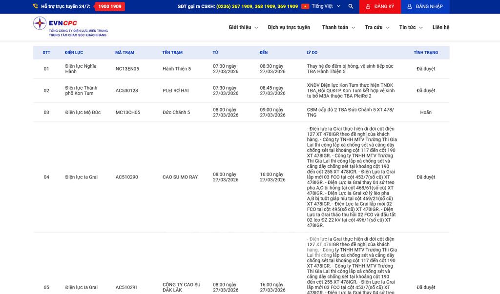 | 2 | Điện lực Thành phố Kon Tum | AC530128 | PLEI RƠ HAI | 07:30 27/03/2026 | 08:45 27/03/2026 | XNDV Điện lực Kon Tum thực hiện TNĐK TBA, Đội QLĐTP Kon Tum kết hợp vệ sinh tu bổ MBA thuộc TBA PleiRơ 2 | Đã duyệt |