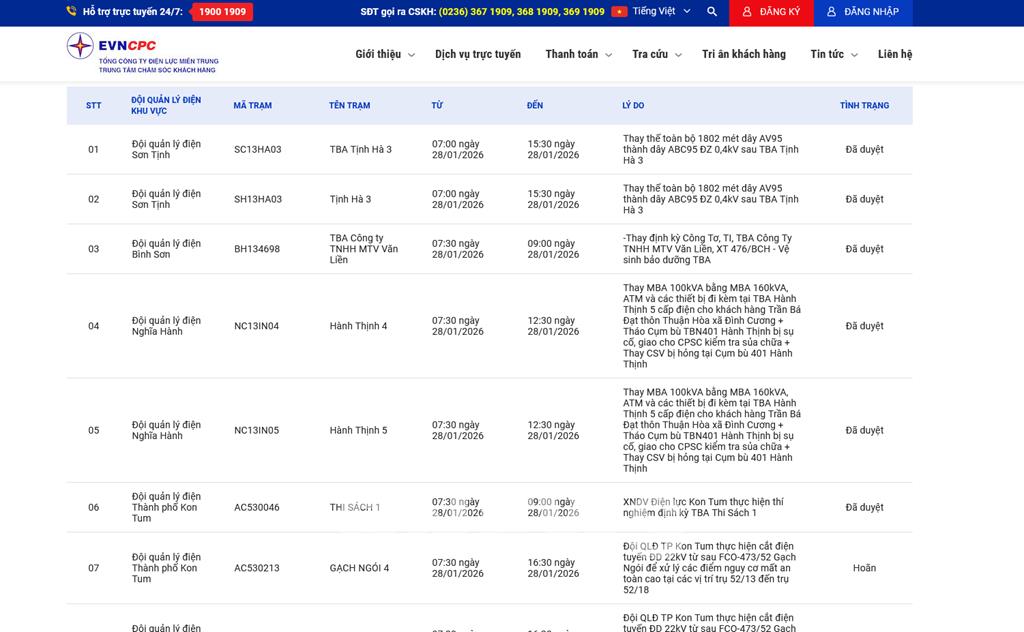 | 10 | Đội quản lý điện TP Quảng Ngãi | AC13NPH3 | TBA Nghĩa Phú 3 | 08:00 28/01/2026 | 09:00 28/01/2026 | Thí nghiệm CBM MBA Nghĩa Phú 3-XT478/QNG | Đã duyệt |
