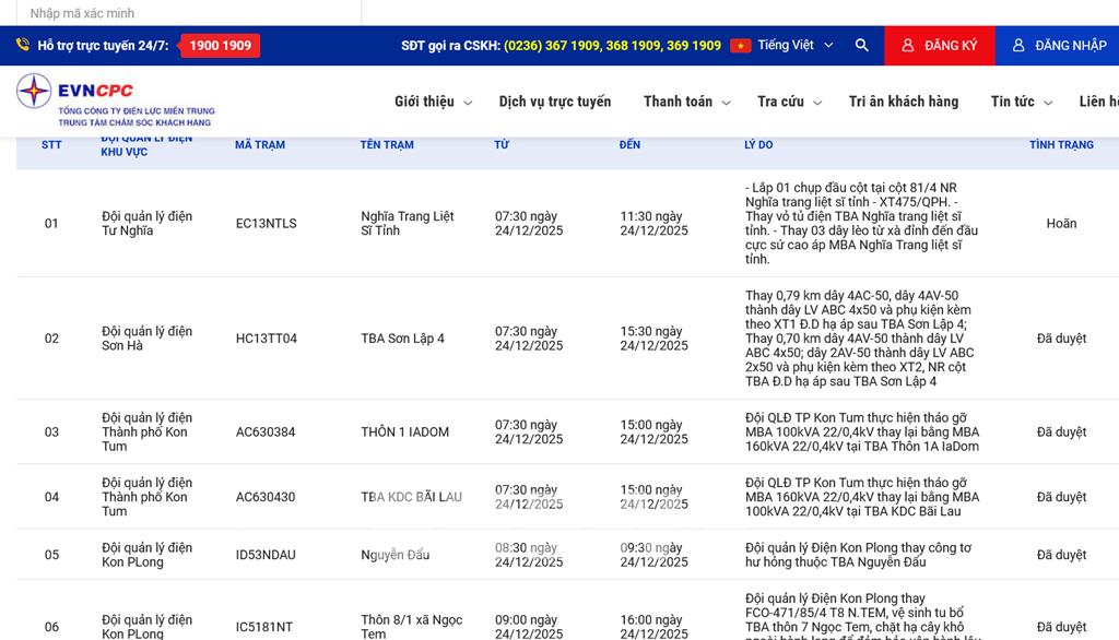 | 3 | Đội quản lý điện Thành phố Kon Tum | AC630384 | THÔN 1 IADOM | 07:30 24/12/2025 | 15:00 24/12/2025 | Đội QLĐ TP Kon Tum thực hiện tháo gỡ MBA 100kVA 22/0,4kV thay lại bằng MBA 160kVA 22/0,4kV tại TBA Thôn 1A IaDom | Đã duyệt |