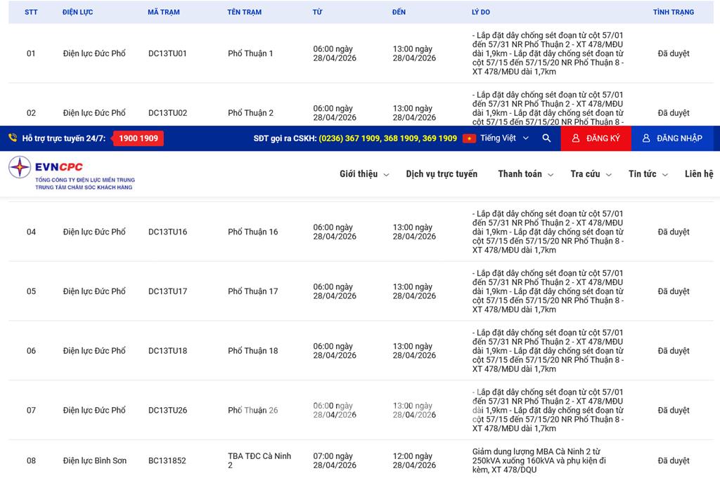 | 2 | Điện lực Đức Phổ | DC13TU02 | Phổ Thuận 2 | 06:00 28/04/2026 | 13:00 28/04/2026 | - Lắp đặt dây chống sét đoạn từ cột 57/01 đến 57/31 NR Phổ Thuận 2 - XT 478/MĐU dài 1,9km- Lắp đặt dây chống sét đoạn từ cột 57/15 đến 57/15/20 NR Phổ Thuận 8 - XT 478/MĐU dài 1,7km | Đã duyệt |