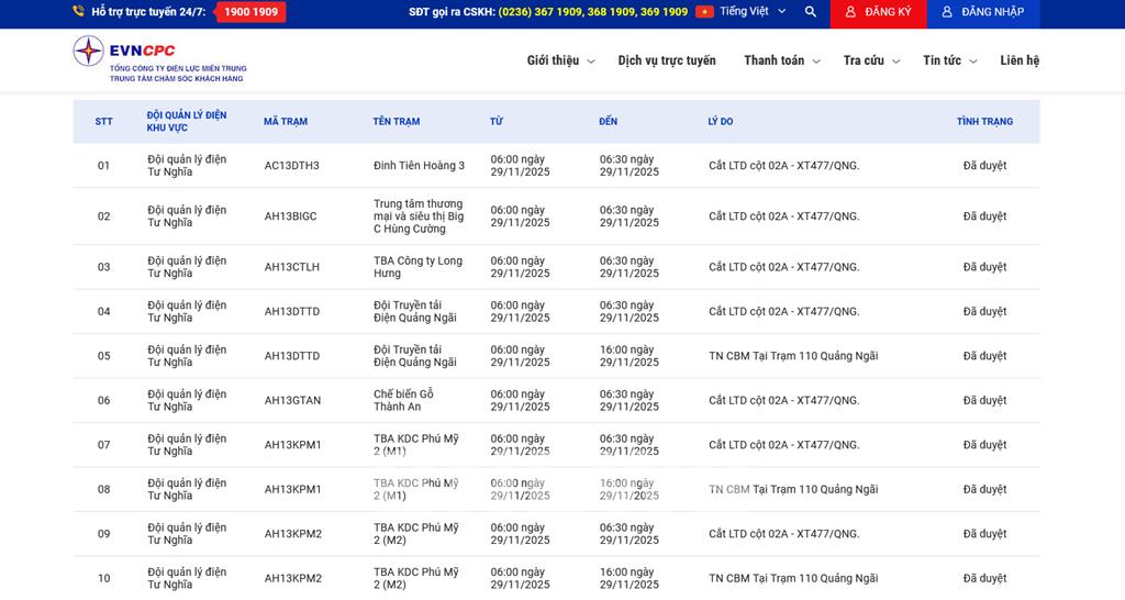 | 2 | Đội quản lý điện Tư Nghĩa | AH13BIGC | Trung tâm thương mại và siêu thị Big C Hùng Cường | 06:00 29/11/2025 | 06:30 29/11/2025 | Cắt LTD cột 02A - XT477/QNG. | Đã duyệt |