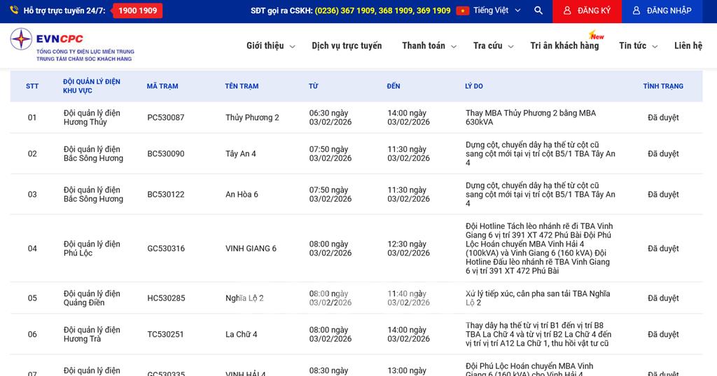| 5 | Đội quản lý điện Quảng Điền | HC530285 | Nghĩa Lộ 2 | 08:00 03/02/2026 | 11:40 03/02/2026 | Xử lý tiếp xúc, cân pha san tải TBA Nghĩa Lộ 2 | Đã duyệt |