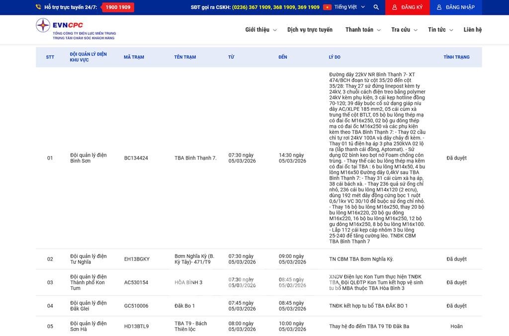 | 10 | Đội quản lý điện Tư Nghĩa | EC13THU8 | Nghĩa Thuận 8 | 09:10 05/03/2026 | 10:40 05/03/2026 | TN CBM TBA Nghĩa Thuận 8. | Đã duyệt |