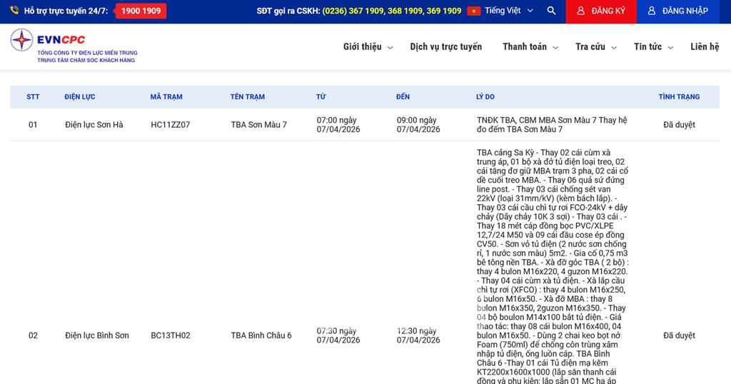 | 2 | Điện lực Bình Sơn | BC13TH02 | TBA Bình Châu 6 | 07:30 07/04/2026 | 12:30 07/04/2026 | TBA cảng Sa Kỳ- Thay 02 cái cùm xà trung áp, 01 bộ xà đở tủ điện loại treo, 02 cái tăng đơ giữ MBA trạm 3 pha, 02 cái cổ dề cuối treo MBA.- Thay 06 quả sứ đứng line post. - Thay 03 cái chống sét van 22kV (loại 31mm/kV) (kèm bách lắp).- Thay 03 cái cầu chì tự rơi FCO-24kV + dây chảy (Dây chảy 10K 3 sợi)- Thay 03 cái . - Thay 18 mét cáp đồng bọc PVC/XLPE 12,7/24 M50 và 09 cái đầu cose ép đồng CV50.- Sơn vỏ tủ điện (2 nước sơn chống rỉ, 1 nước sơn màu) 5m2.- Gia cố 0,75 m3 bê tông nền TBA.- Xà đỡ góc TBA ( 2 bộ) : thay 4 bulon M16x220, 4 guzon M16x220.- Thay 04 cái cùm xà tủ điện.- Xà lắp cầu chì tự rơi (XFCO) : thay 4 bulon M16x250, 6 bulon M16x50. - Xà đỡ MBA : thay 8 bulon M16x350, 2guzon M16x350.- Thay 04 bộ boulon M14x100 bắt tủ điện.- Giá thao tác: thay 08 cái bulon M16x400, 04 bulon M16x50.- Dùng 2 chai keo bọt nở Foam (750ml) để chống côn trùng xâm nhập tủ điện, ống luồn cáp.TBA Bình Châu 6-Thay 01 cái Tủ điện mạ kẽm KT2200x1600x1000 (lắp săn thanh cái đồng và phụ kiện; lắp sẵn 01 MC hạ áp 1600A, 01 ATM 630A loại có dãi chỉnh định, 03 ATM 400A loại có dãi chỉnh định).- Thay 02 cái cùm xà trung áp.- Thay 12 quả sứ đứng line post, 12 mét cáp đồng bọc PVC/XLPE 12,7/24 M50 và 24 cái Ốc siết cáp đồng 4/0 (48-120 mm2) để đấu cánh cung.- Sơn vỏ MBA (2 nước sơn chống rỉ, 1 nước sơn màu) 15m2, 24 mét ng nhựa xoắn HDPE F120- Dùng 2 chai keo bọt nở Foam (750ml) để chống côn trùng xâm nhập tủ điện, ống luồn cáp.- TNĐK CBM TBA Bình Châu 6- TNĐK CBM cáp ngầm đoạn từ cột 358/9 -358/10, XT 472/DQU- Thay định kỳ Công Tơ, TI, TBA Bình Châu 6- Vệ sinh bảo dưỡng TBA | Đã duyệt |