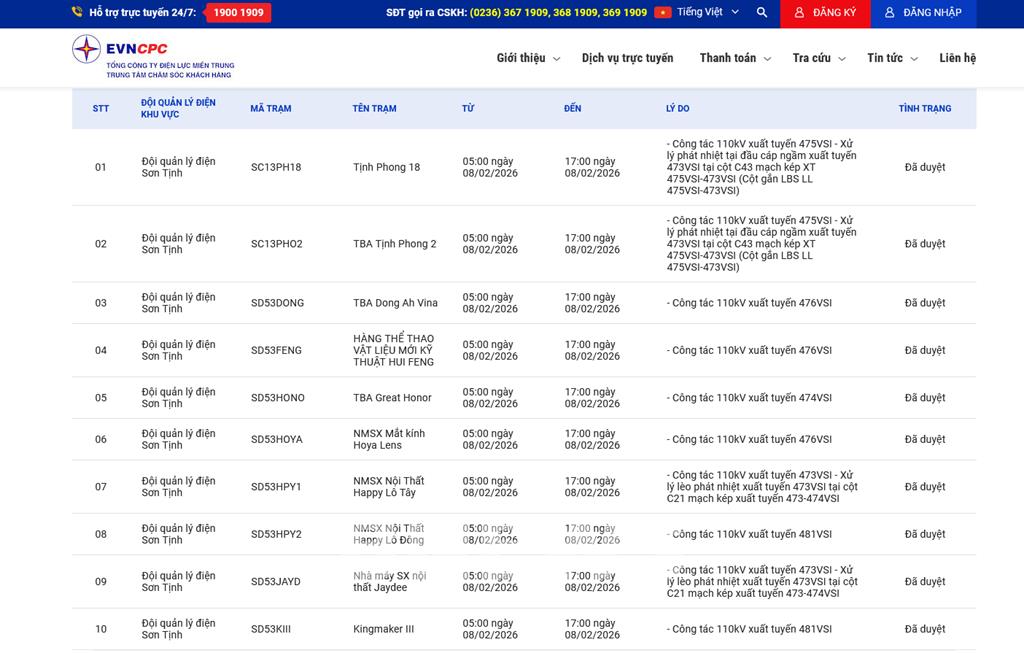 | 9 | Đội quản lý điện Sơn Tịnh | SD53JAYD | Nhà máy SX nội thất Jaydee | 05:00 08/02/2026 | 17:00 08/02/2026 | - Công tác 110kV xuất tuyến 473VSI- Xử lý lèo phát nhiệt xuất tuyến 473VSI tại cột C21 mạch kép xuất tuyến 473-474VSI | Đã duyệt |