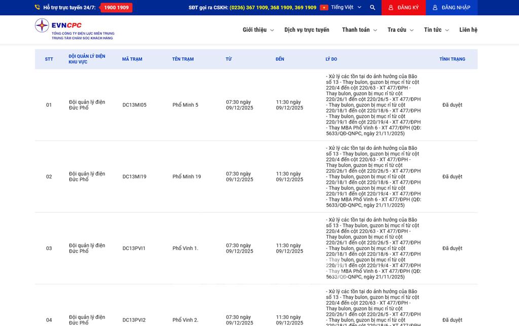 | 5 | Đội quản lý điện Đức Phổ | DC13PVI3 | Phổ Vinh 3. | 07:30 09/12/2025 | 11:30 09/12/2025 | - Xử lý các tồn tại do ảnh hưởng của Bão số 13- Thay bulon, guzon bị mục rỉ từ cột 220/4 đến cột 220/63 - XT 477/ĐPH- Thay bulon, guzon bị mục rỉ từ cột 220/26/1 đến cột 220/26/5 - XT 477/ĐPH- Thay bulon, guzon bị mục rỉ từ cột 220/18/1 đến cột 220/18/6 - XT 477/ĐPH- Thay bulon, guzon bị mục rỉ từ cột 220/19/1 đến cột 220/19/4 - XT 477/ĐPH- Thay MBA Phổ Vinh 6 - XT 477/ĐPH (QĐ: 5633/QĐ-QNPC, ngày 21/11/2025) | Đã duyệt |