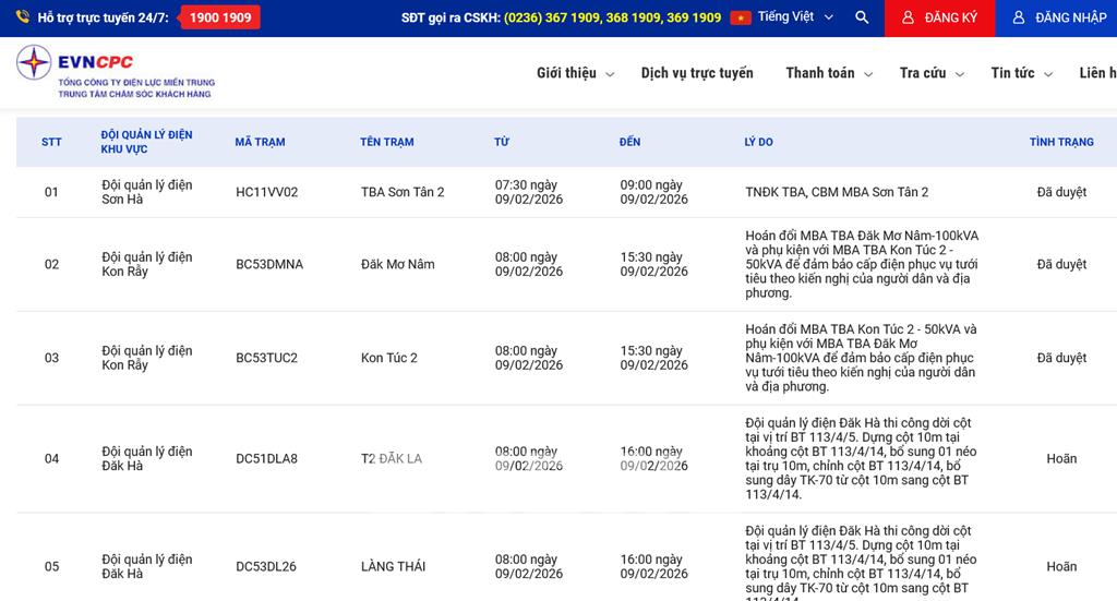 | 2 | Đội quản lý điện Kon Rẫy | BC53DMNA | Đăk Mơ Nâm | 08:00 09/02/2026 | 15:30 09/02/2026 | Hoán đổi MBA TBA Đăk Mơ Nâm-100kVA và phụ kiện với MBA TBA Kon Túc 2 - 50kVA để đảm bảo cấp điện phục vụ tưới tiêu theo kiến nghị của người dân và địa phương. | Đã duyệt |